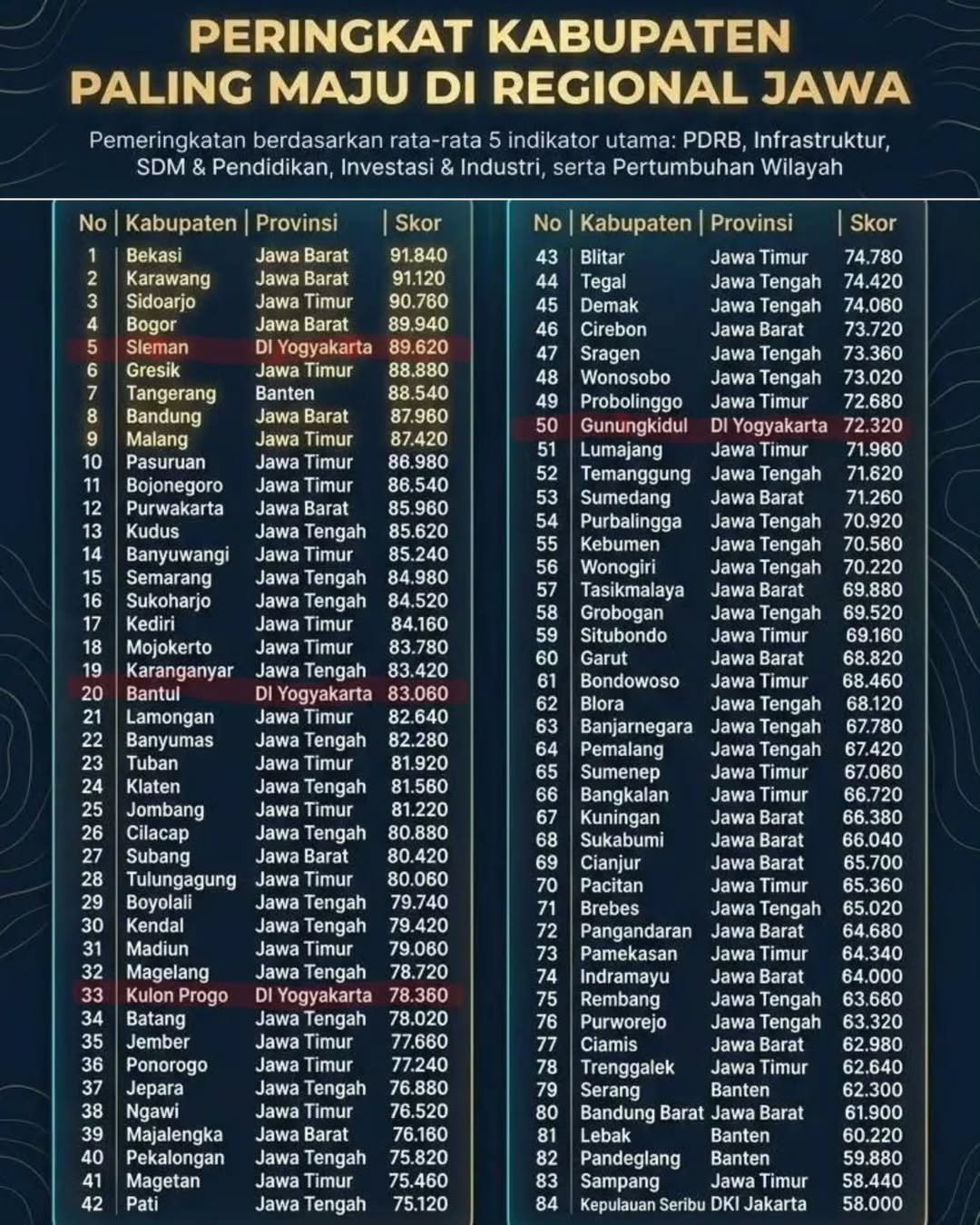 Pemeringkatan tersebut disusun berdasarkan lima indikator utama, yakni PDRB, infrastruktur, kualitas SDM dan pendidikan, investasi dan industri, serta pertumbuhan wilayah. Dari 84 kabupaten di Pulau Jawa, hasilnya memperlihatkan peta kemajuan yang kompetitif dan dinamis.