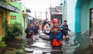 Relawan Muhammadiyah Kota Pekalongan bergerak cepat melakukan evakuasi darurat warga Perum Griya Sejahtera, Kelurahan Tirto, yang terdampak banjir. Akibat luap sungai, ratusan rumah terendam air, membuat warga kesulitan melakukan aktivitas sehari-hari, Ahad (18/1/2026).