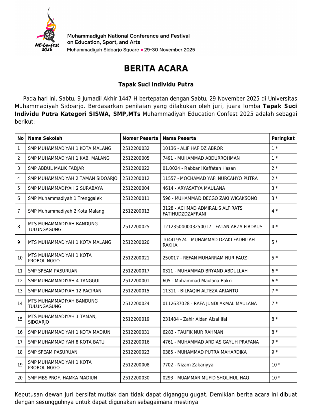 Cabang Tapak Suci pada ajang Muhammadiyah Education Conference Sport, Arts, and Festival (ME Confest) 2025) sukses digelar selama dua hari, Sabtu–Ahad (29–30/11/2025) di GOR SMA Muhammadiyah 2 (SMAMDA) Sidoarjo.