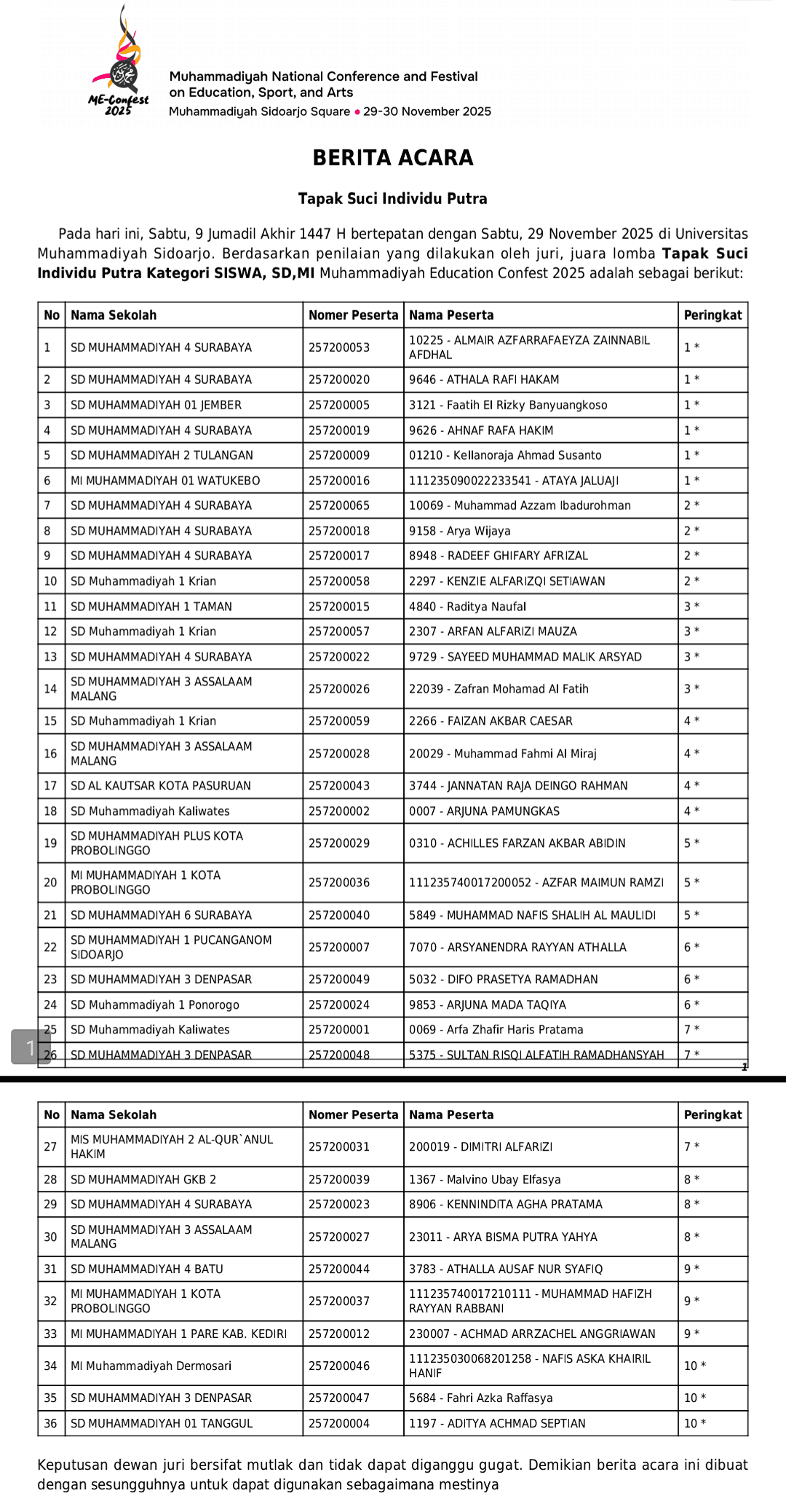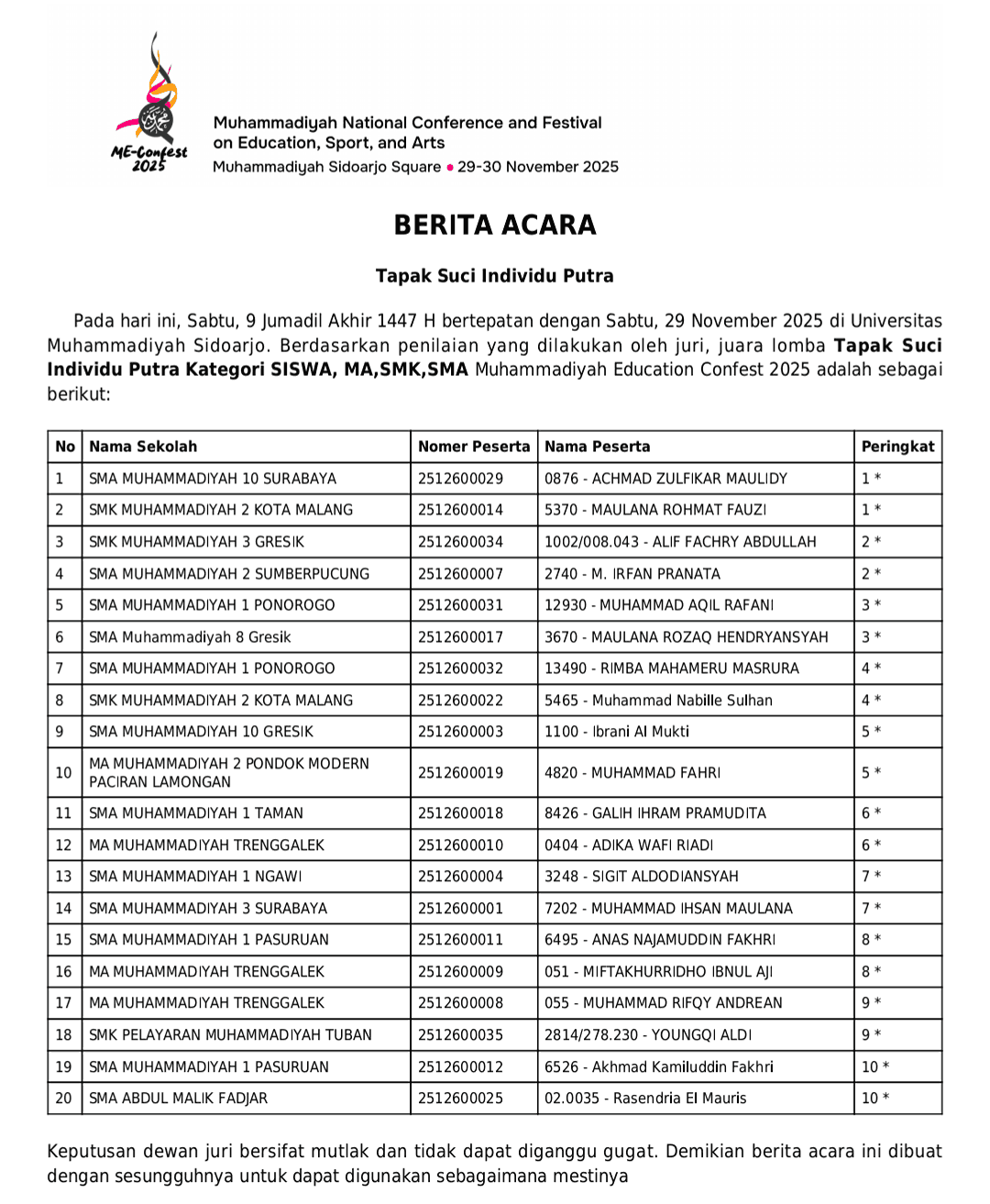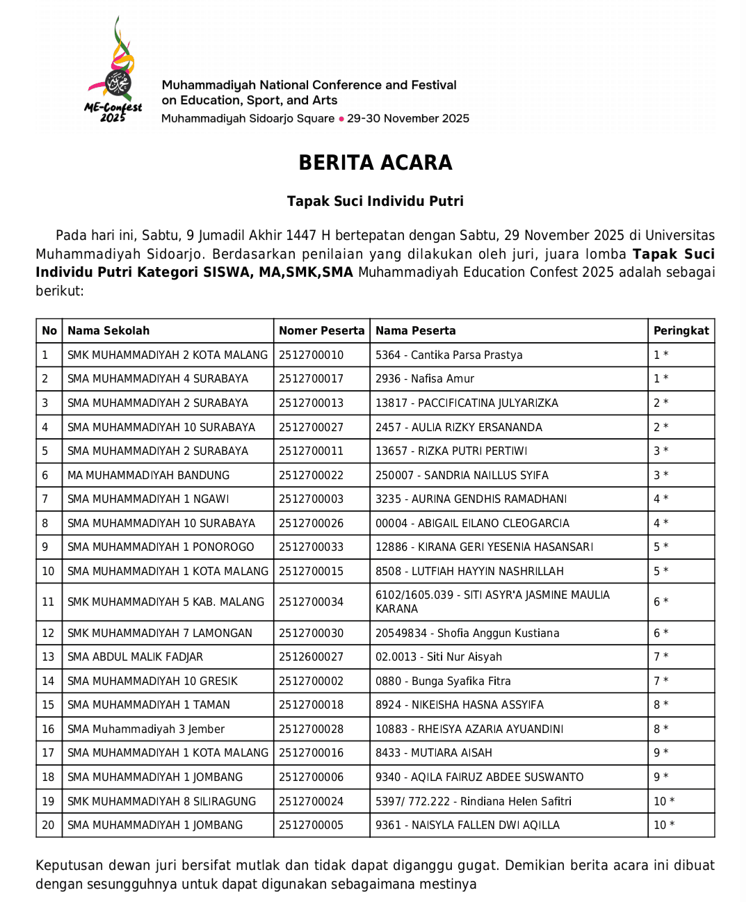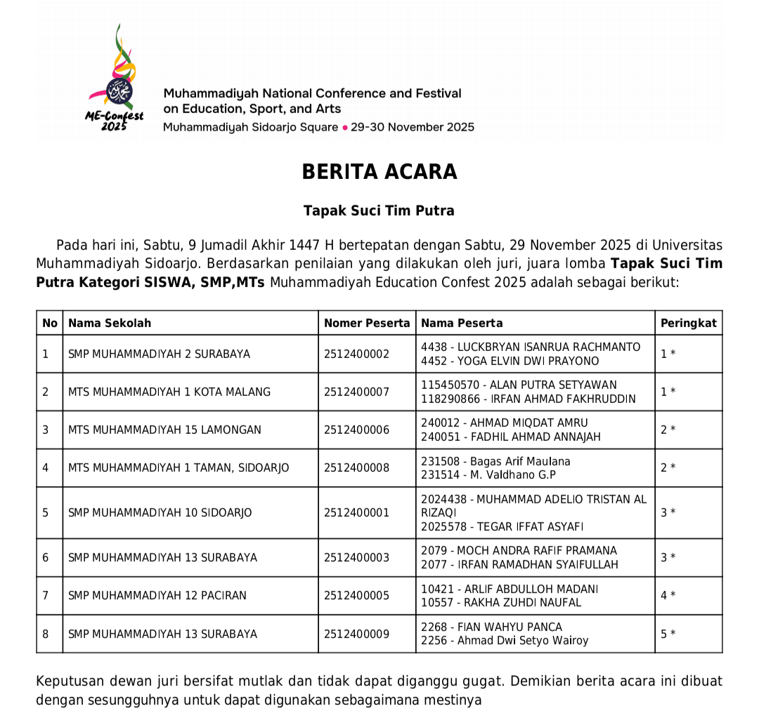 Cabang Tapak Suci pada ajang Muhammadiyah Education Conference Sport, Arts, and Festival (ME Confest) 2025) sukses digelar selama dua hari, Sabtu–Ahad (29–30/11/2025) di GOR SMA Muhammadiyah 2 (SMAMDA) Sidoarjo.