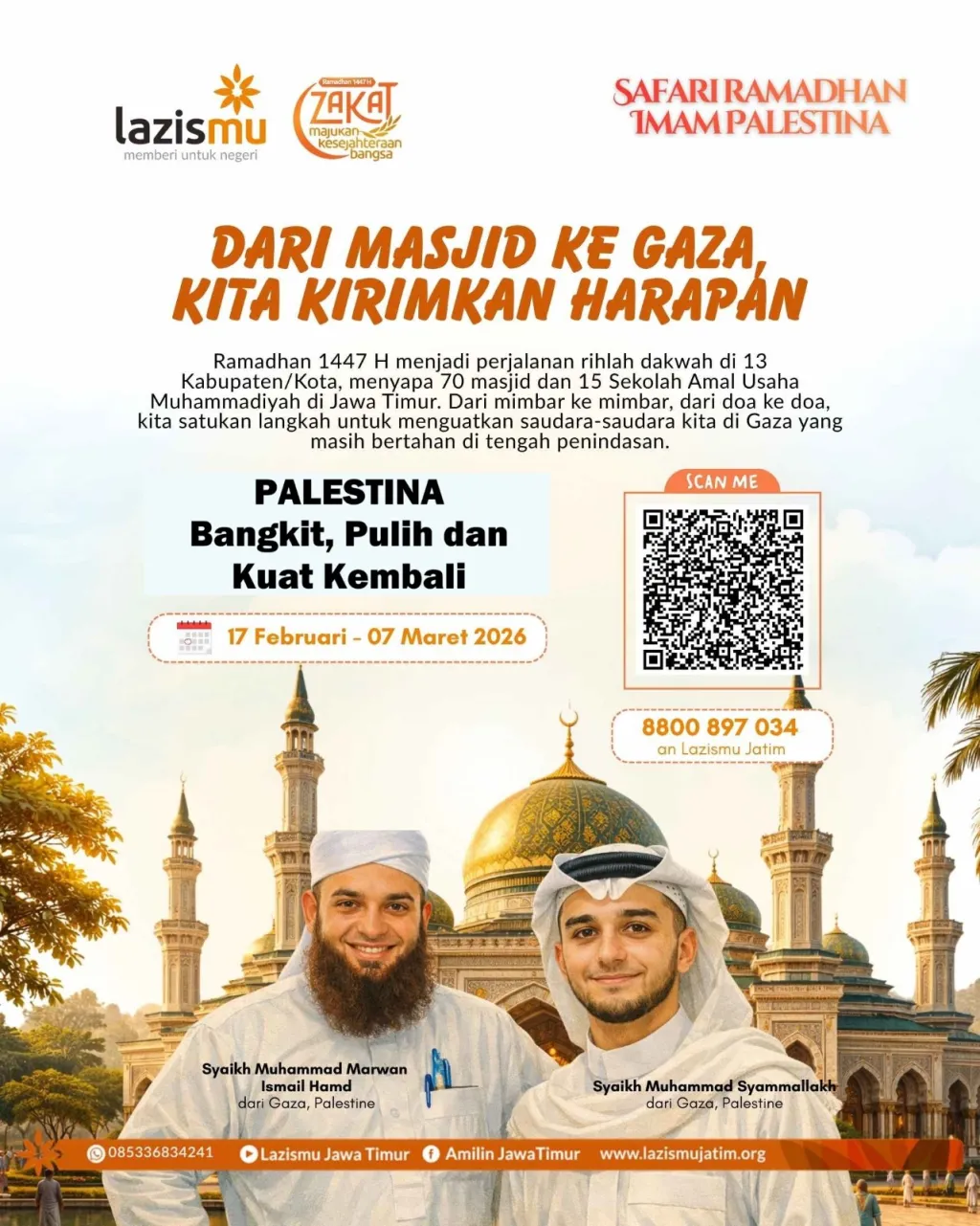 LAZISMU Jawa Timur kembali menggelar program Safari Dakwah Imam Palestina dalam rangka menyemarakkan Ramadhan 1447 Hijriyah. Dua imam asal Gaza, Palestina, tiba di Bandara Internasional Juanda Surabaya pada Selasa (17/02/2026) untuk memulai rangkaian safari dakwah di berbagai daerah di Jawa Timur selama 20 hari ke depan.