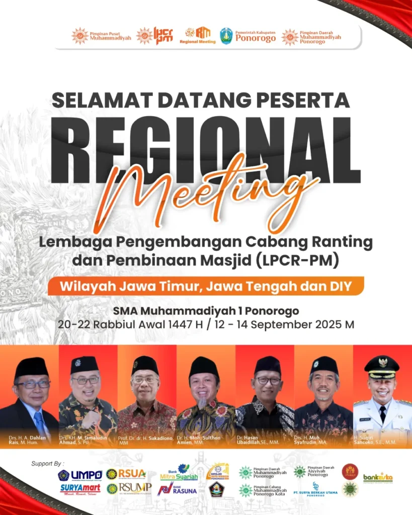 Kabupaten Ponorogo akan menjadi pusat perhatian bagi kader Muhammadiyah pada 12–14 September 2025 mendatang. Lembaga Pengembangan Cabang Ranting dan Pengembangan Masjid (LPCRPM) akan menggelar Regional Meeting Wilayah Jawa Timur, Jawa Tengah, dan DI Yogyakarta di SMA Muhammadiyah 1 Ponorogo.