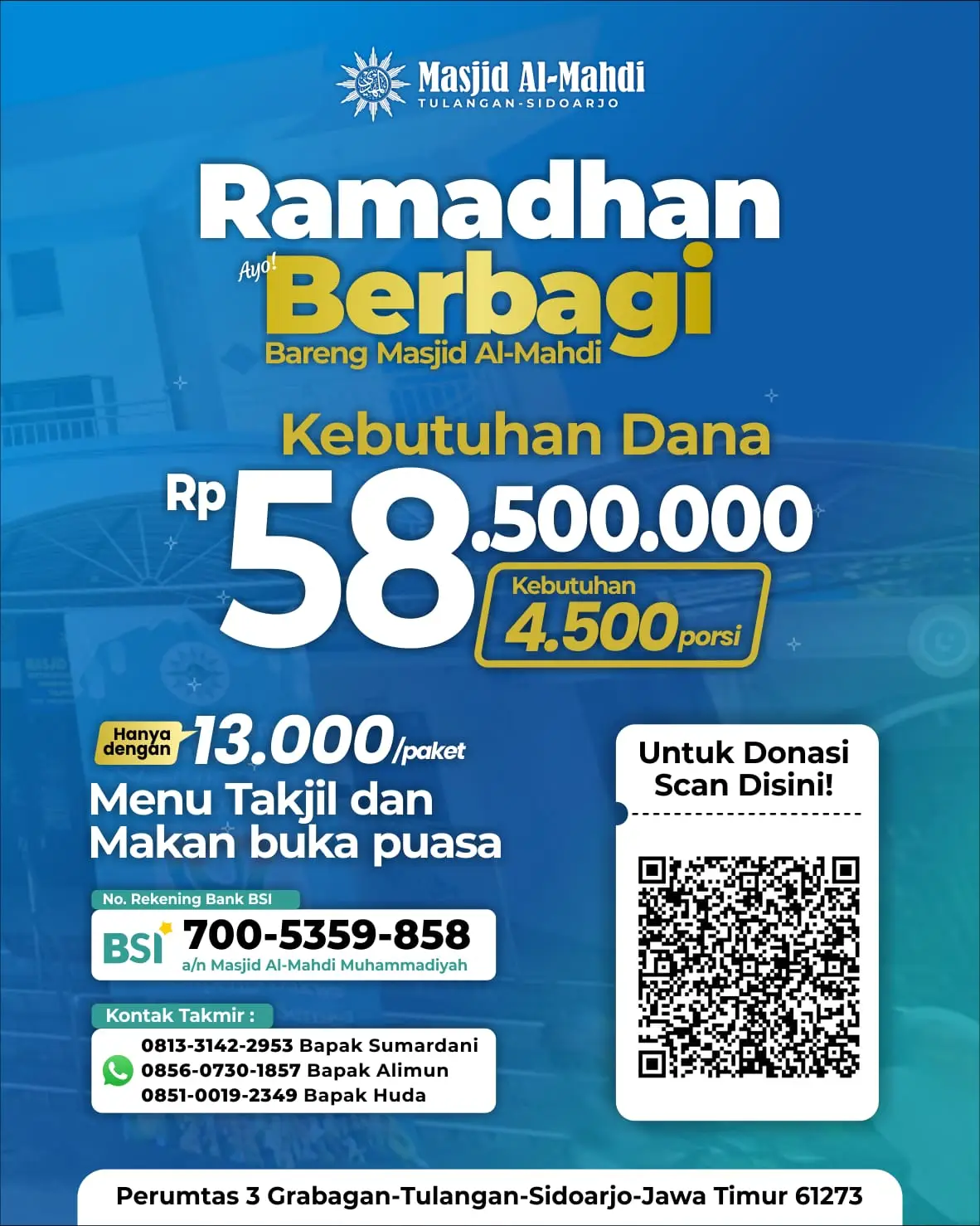 Tahun ke-5, Masjid Al Mahdi Perumtas 3 Grabagan Tulangan kembali menyediakan makan buka puasa selama Ramadan satu bulan penuh dengan 150 porsi setiap hari, Program berbagi buka puasa digagas oleh Takmir Masjid Al Mahdi pada Ramadan 1447 Hijriah