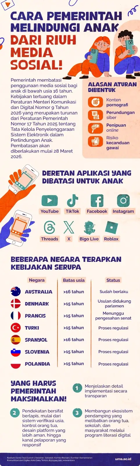 Dosen Teknik Informatika Universitas Muhammadiyah Surakarta (UMS), Endang Wahyu Pamungkas, S.Kom., M.Kom., Ph.D., menilai arah kebijakan tersebut pada dasarnya cukup masuk akal karena berangkat dari kebutuhan nyata untuk melindungi anak dari berbagai ancaman digital.