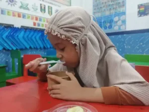Sebelum makan, guru kembali mengingatkan adab yang telah dipelajari, seperti membaca doa, makan menggunakan tangan kanan, makan sambil duduk, tidak berbicara saat makan, serta berhenti makan sebelum kenyang.